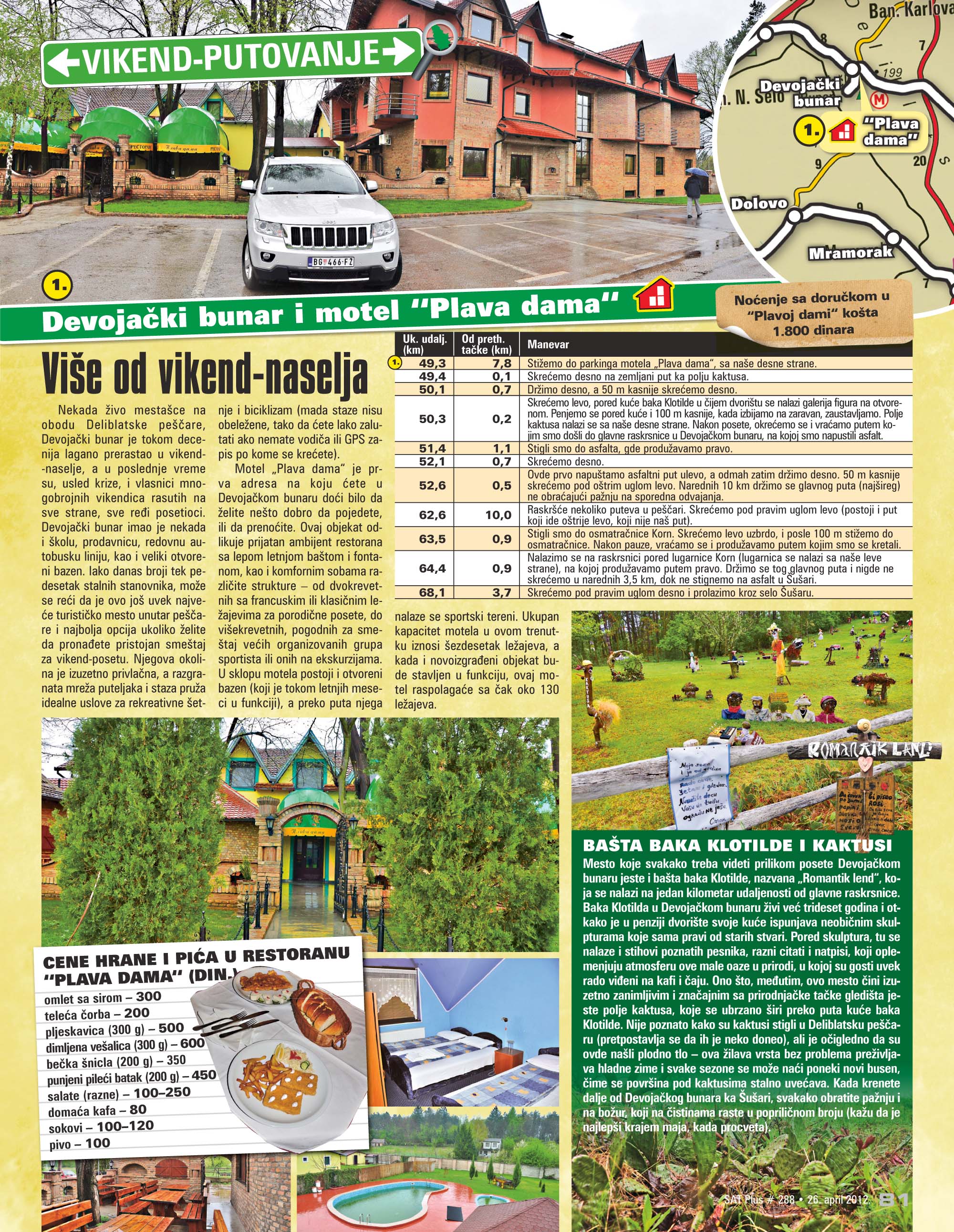 Deliblatska peščara (foto: Milan Z. Uljmanski) Opisov ni prav dosti in na internetu je treba kar nekaj časa iskati, da si iz posameznih točk sestaviš sliko. Končno najdem avtomobilistično revijo, v kateri je avtor leta 2012 na petih straneh opisal pot skozi Deliblatsko peščaro. V okvirčku na 10 % strani je kratek opis "Bašta bake Klotilde i kaktusi", nad njo pa še nenavadna fotografija – že na prvi pogled vredno ogleda. V članku je tudi kratek opis poti – ampak ko "na licu mesta" v naselju Devojački bunar slediva opisu poti, ne vidiva nič takega, kar bi bilo podobno zanimivostim na sliki. Prašne "ulice" nimajo imen, kažipotov, ki bi nama bili v pomoč, pa ni. Obrneva se torej nazaj proti glavni cesti. Na poti srečava žensko in jo vprašava, kje je zadeva, ki je opisana v članku. Morda je bilo narobe to, da sva omenila kaktuse, kajti odgovor je bil povsem nepričakovan: "Ne, tega pa ni tukaj. Bosta morala iti v Pančevo". (Za nepoznavalce: Pančevo je kakih 40 km stran in mimo tega mesta sva šla na poti iz Beograda proti Deliblatski peščari.) Z Olgo se samo spogledava in ne rečeva nič. Vrneva se v hotel, kjer sva nameravala prenočiti. Natakarja ni, kuharicam pa je zadeva znana: "Ja, ja, seveda, na drugem križišču zavijete desno in potem ..." Zavijem torej desno na naslednjem križišču, v začetku je še nekaj hiš, sčasoma pa vedno manj. Na peščeni poti je na sredini vedno večji greben in kmalu čutiva, kako dno avtomobila nežno drsi po mehki travi. Zaenkrat je prijetno, ko bo avto nasedel, bo pa precej manj. Grmovje ob cesti je vedno višje, vse gostejše in vse bliže. Jebala te baka Klotilda! V goščavi ni možno obrniti, zato peljem vzvratno nekaj sto metrov in končno najdem dovolj prostora, da obrnem avto. Še dobro, da v teh krajih ni ljudožercev, sicer bi si mislil, da so naju namenoma poslali v tak neprehoden svet. Na glavnem križišču ponovno razmisliva: glede na opis v članku in glede na stanje na terenu je bil prvi poskus verjetno pravilen, le da v labirintu križišč nisva izbrala prave potke. Poskusiva še tretjič. Olga vpraša fanta, ki nama prideta naproti. "Ja, ja, saj ste blizu: najprej greste mimo ograde, v kateri so konji. Na drugem odcepu za ogrado zavijete desno in čez kakih sto metrov bo magični vrt na levi strani." Glej, glej–končno nekdo pozna zadevo! Pred nama se odpre neverjeten prizor ... Nepoznavalcu bi se zdelo, da gre za sceno iz kakega filma ali gledališke predstave ... Ker se teren rahlo dviguje, z enega mesta vidiva sveže pokošen travnik površine več kakor 1000 m2, posejan z raznimi fantazijskimi figurami različnih velikosti, oblik in barv.